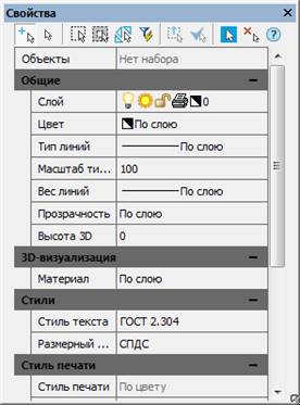 В левом столбце окна Свойства отображаются свойства (параметры) объектов, в правой - их значения. Информация в окне Свойства в зависимости от текущей команды и характера выбранных объектов отображает различные свойства (параметры) объектов. Если в текущем документе не выбран ни один объект, то в строке списка свойств Объекты отображается сообщение Нет набора: