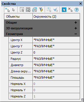 Если у какого-либо свойства поле значения имеет сообщение *РАЗЛИЧНЫЕ*, это означает, что среди выбранных объектов есть два или более объекта, обладающих этим свойством, но значения данного свойства у объектов не совпадают, например, координаты центра для двух не концентрических окружностей: