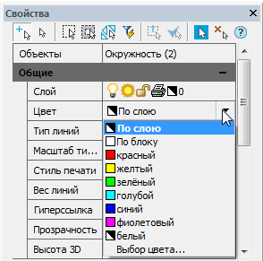 Некоторые свойства объектов, например, цвет, слой, тип линий, вес линий, можно выбирать из раскрывающегося списка: