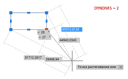 Не все динамические размеры могут быть одновременно видны на экране. Количество одновременно отображаемых размеров в процессе редактирования объекта за ручки, регулируется переменной DYNDIVIS. В зависимости от ее значения, одновременно могут отображаться: